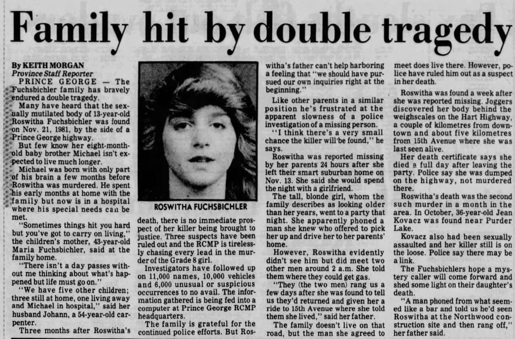 On November 21, 1981, the body of 13-year-old Roswitha Fuchsbichler was found by joggers in the woods north of Prince George, British Columbia, a week after she went missing.