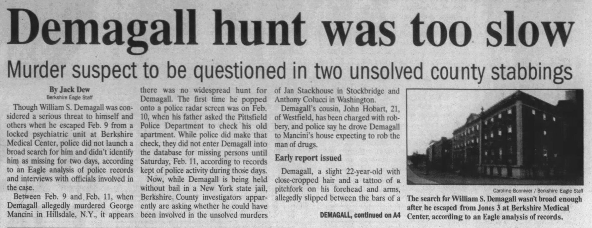 In early 2006, a more unsettling rumor began to circulate. That February, 22-year-old William Demagall—described as a “transient” and survivalist in the Berkshires region—escaped from a psychiatric unit at Berkshire Medical Center in Pittsfield, 30 minutes north of Stockbridge.