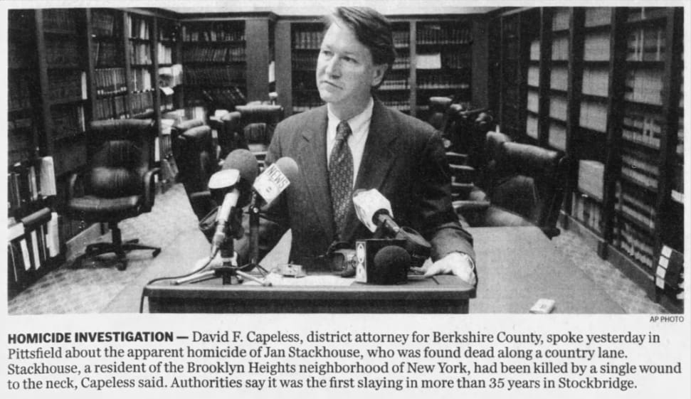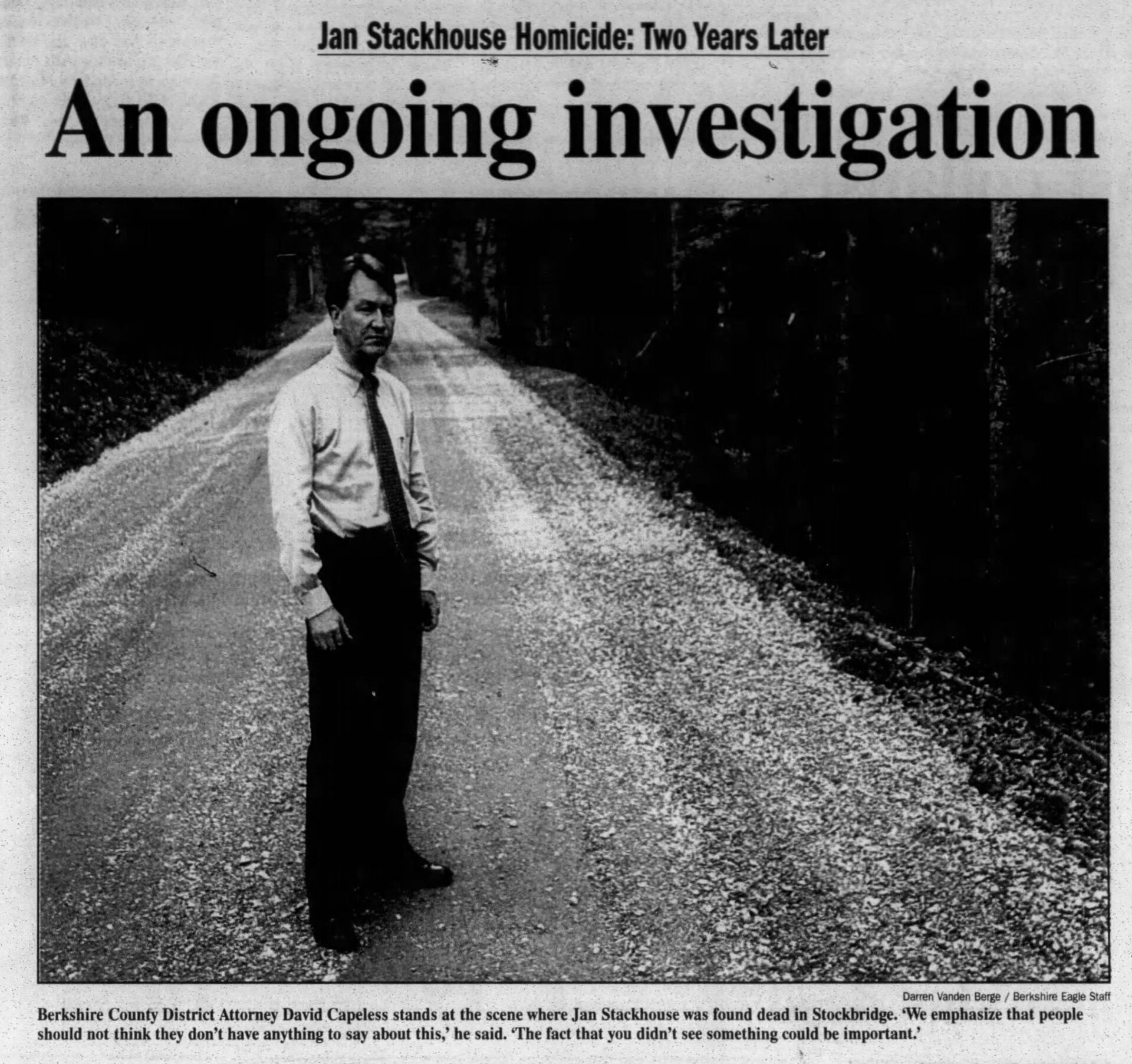 By May 2007, the case remained unsolved. When The Berkshire Eagle surveyed Stockbridge residents that month, 46% believed the mystery of Jan’s death would continue, while 43% thought no one would ever be charged in her death. Only 11% felt the perpetrator would eventually be caught.