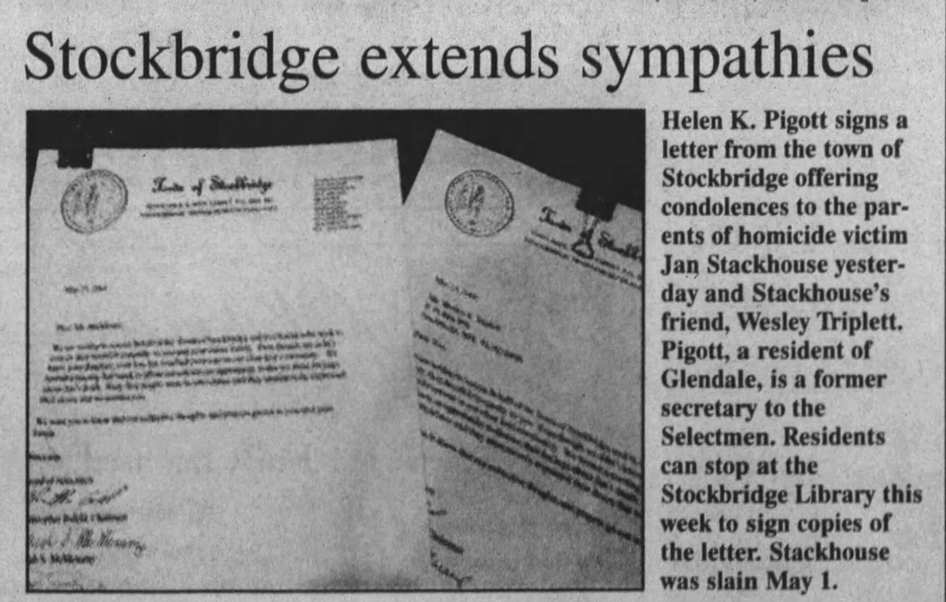 During the meeting, it was agreed that the town of Stockbridge would write condolence letters to the family of Jan Stackhouse and to Wesley Triplett, who had now lost, in the span of one month, a longtime partner and a close friend. More than 140 residents signed Jan’s letter in the days that followed. Despite the meeting’s positive outlook, Police Chief Wilcox was unable to provide progress on the case.